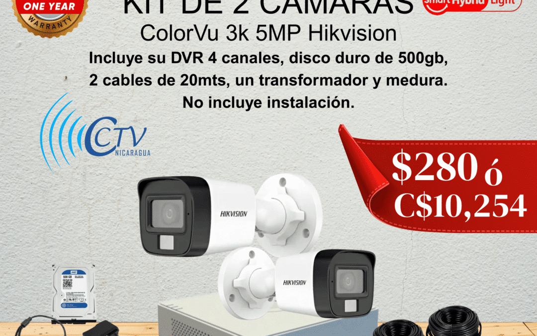 1 DVR 4ch Hikvision 3K 1 Disco duro 500GB 2 Camaras Hikvision Colorvu 3k 5mp 24/7 Colores, Uso interiores o exteriores 40 Metros Cableado para las 2 Camaras (2 cables 20 metros) Conectores Balum, Pigtail, Transformador y medusa Un año de Garantía en DVR y CÁMARAS