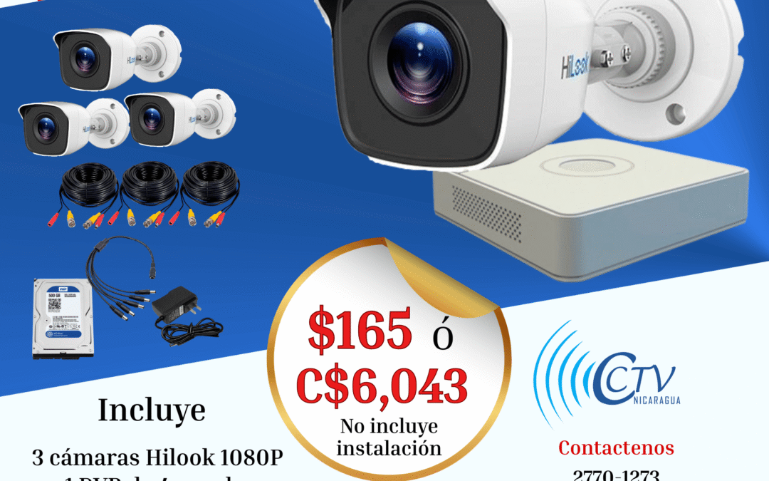 1 DVR 4ch Hilook 1080p 1 Disco duro 500GB 3 Camaras Hilook 1080p 2MP para interiores o exteriores 60 Metros Cableado para las 3 Camaras (3 cables 20 metros) Conectores Balum, Pigtail, Transformador y medusa Un año de Garantía en DVR y CÁMARAS